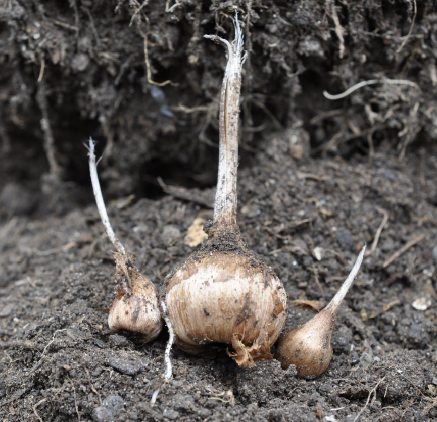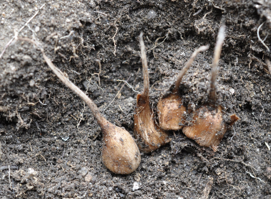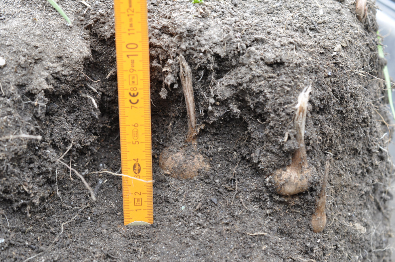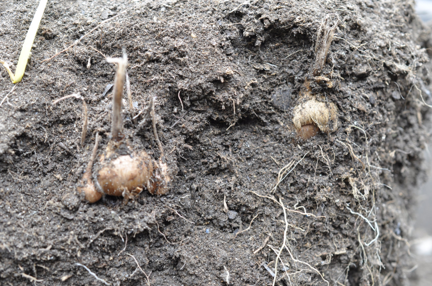 More corms again — here you can see that the original corms were planted around 100 mm deep. From 100 to 150 mm is recommended: