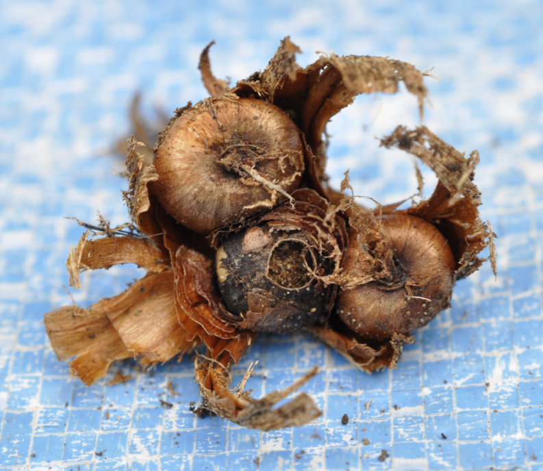 Removing the other large one to its right, plus a bit more clearing again, revealed these four daughter corms behind it: