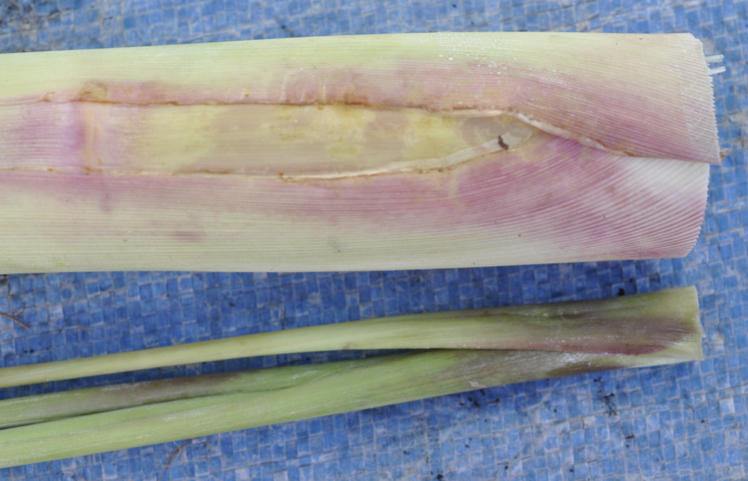 I did track down this most excellent publication on sugarcane diseases and found two that cause an internal red mass: Fusarium sett rot caused by the fungus Fusarium sacchari (p36), and pineapple sett rot caused by the fungus Ceratocystis paradoxa (p37). (Setts are cane segments used for propagation — think cuttings.)