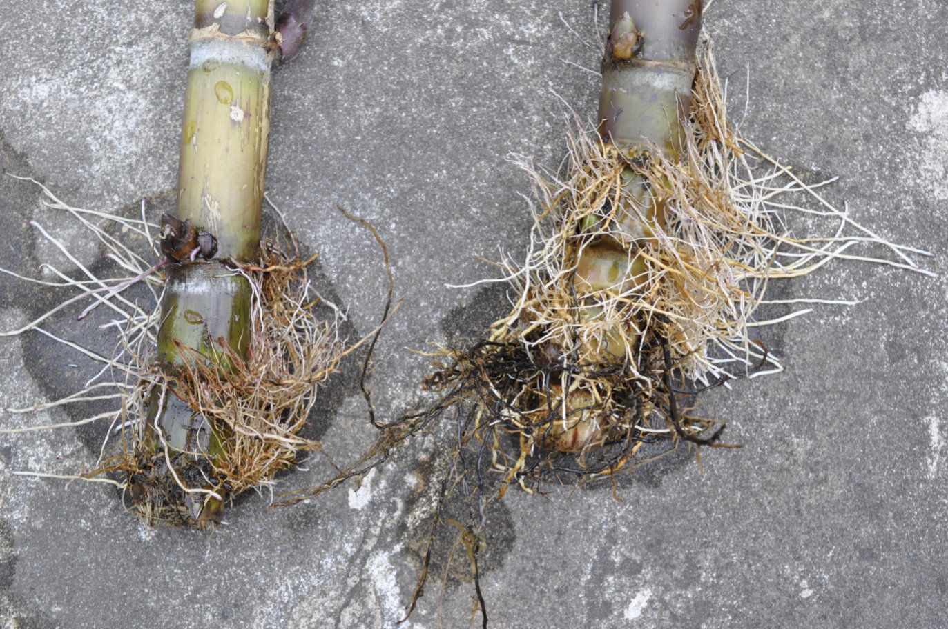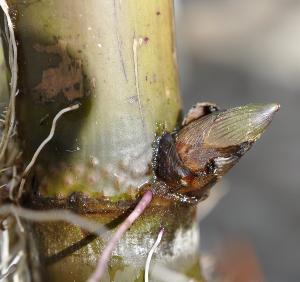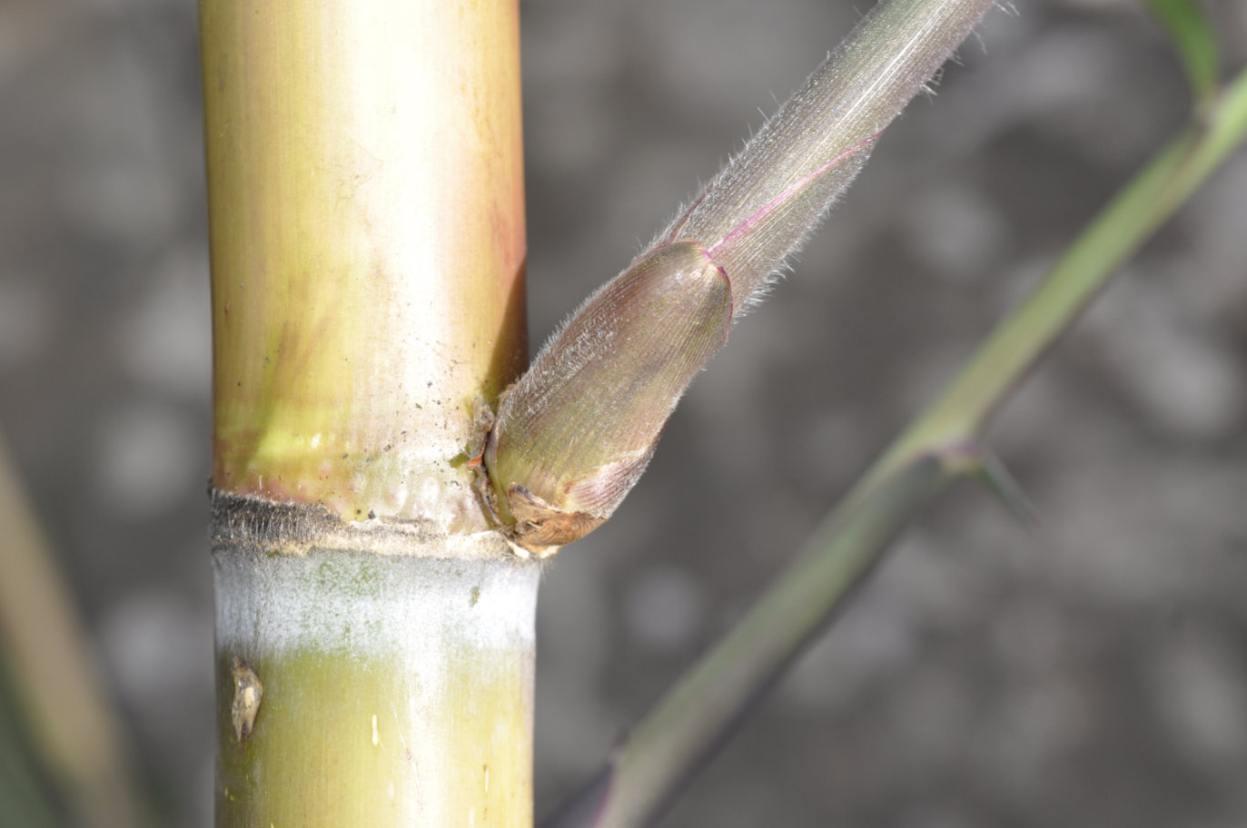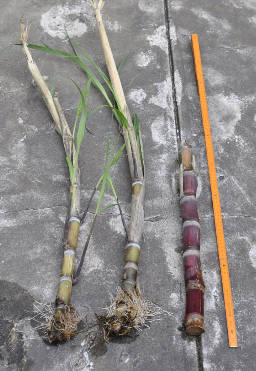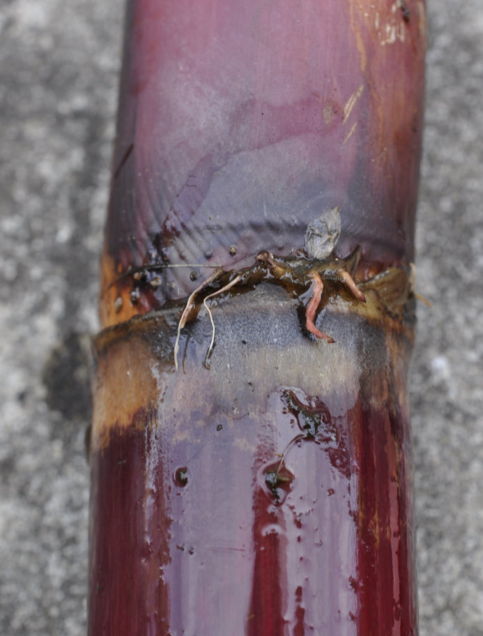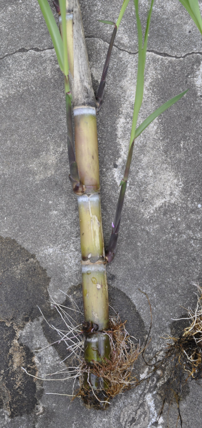 Here is a piece of sugarcane with the leaf base visibly wrapped around the stem. Note the orientation of that leaf — this way is up: